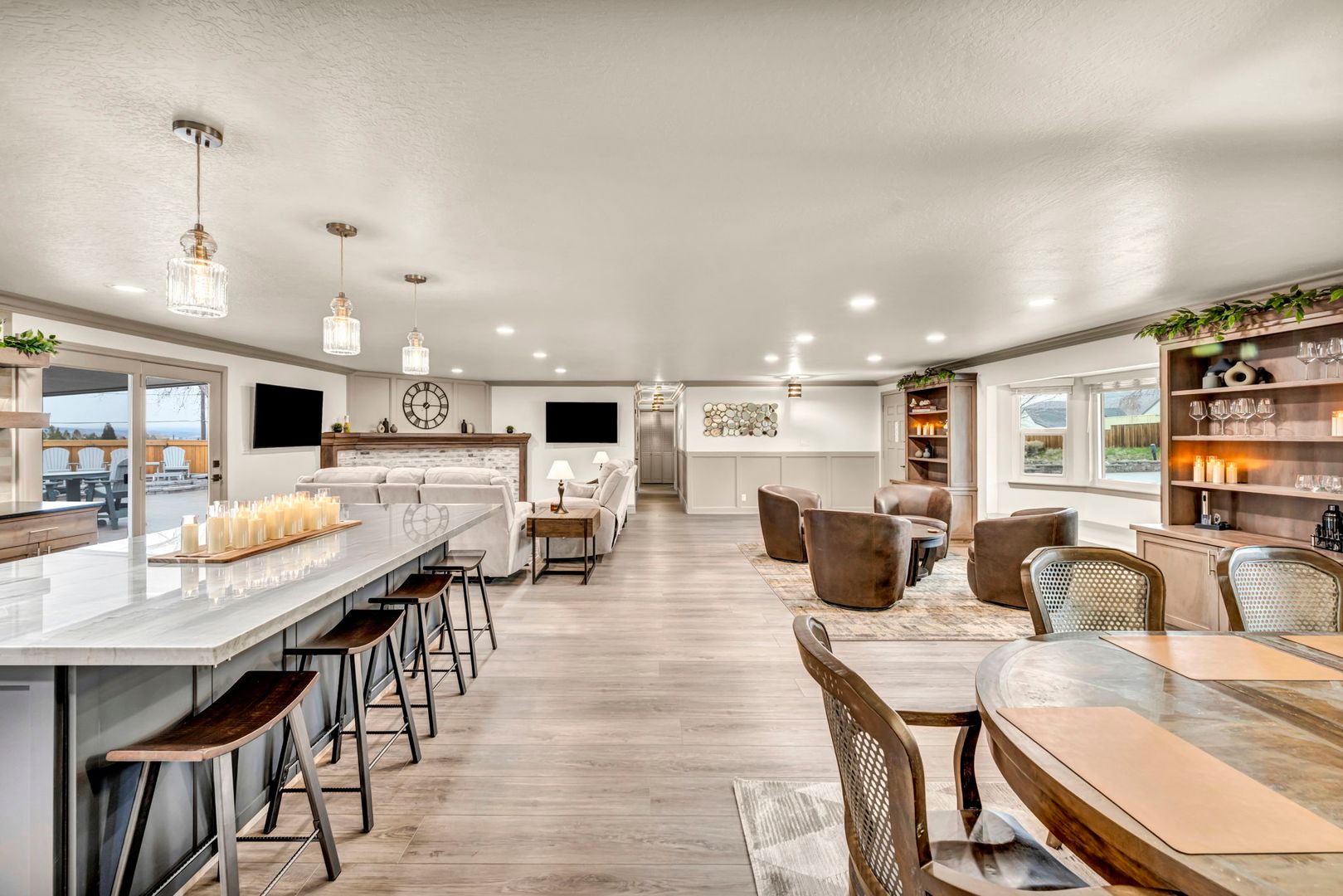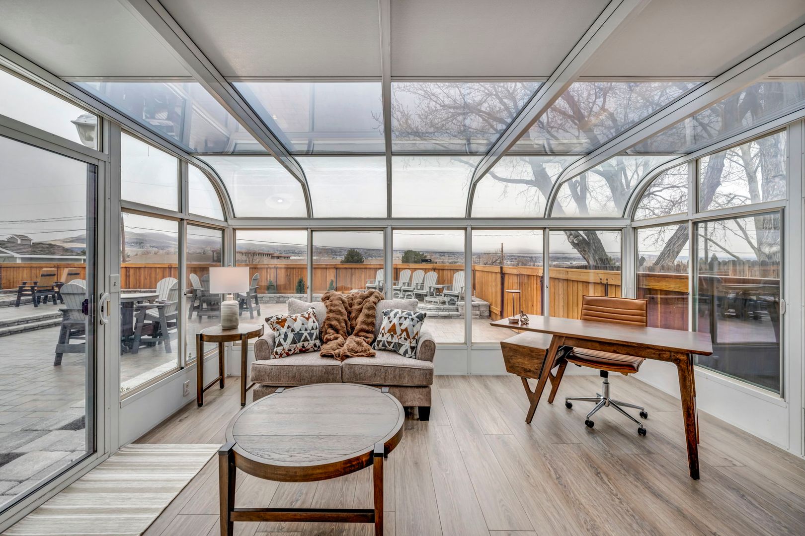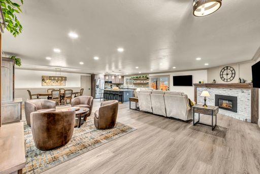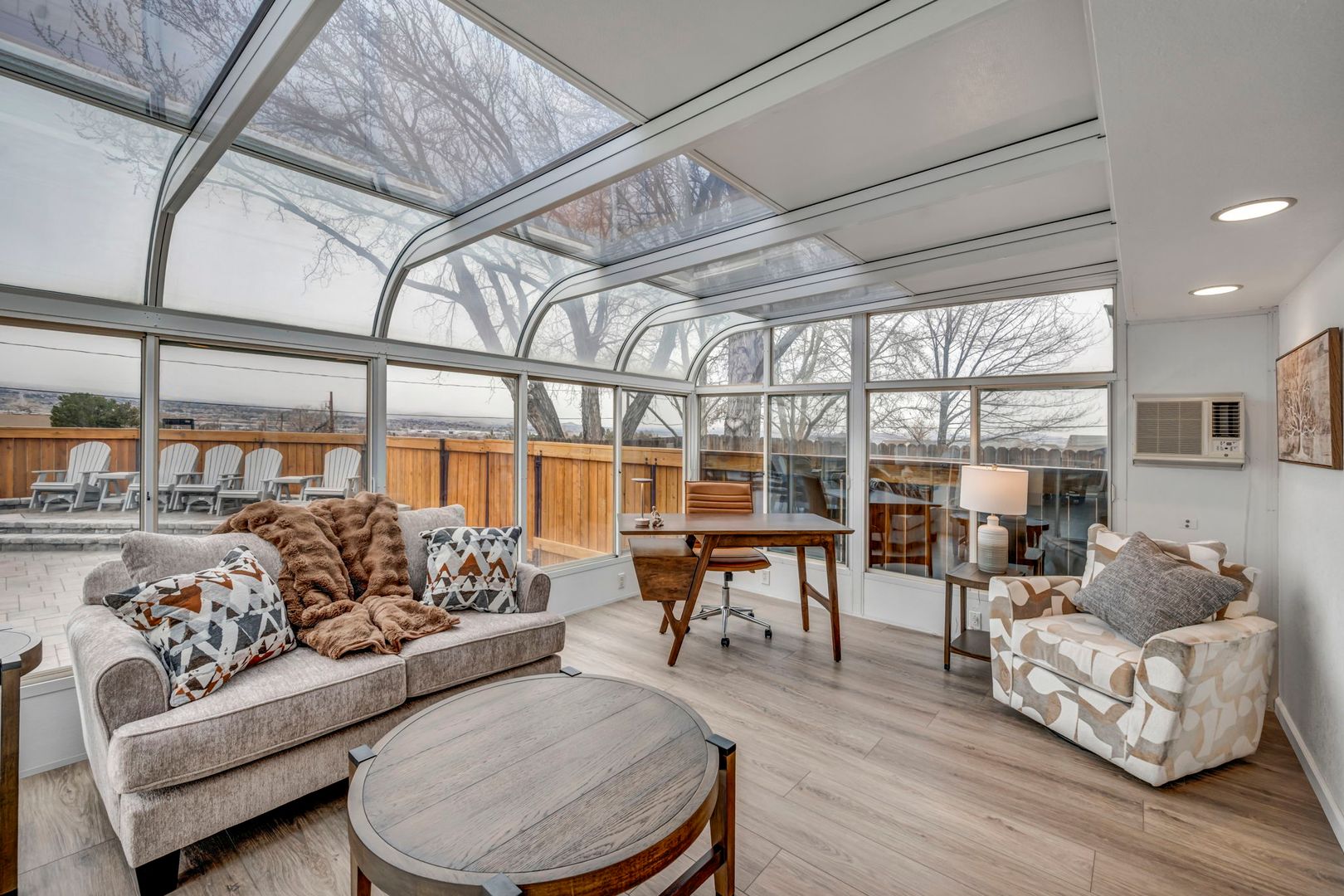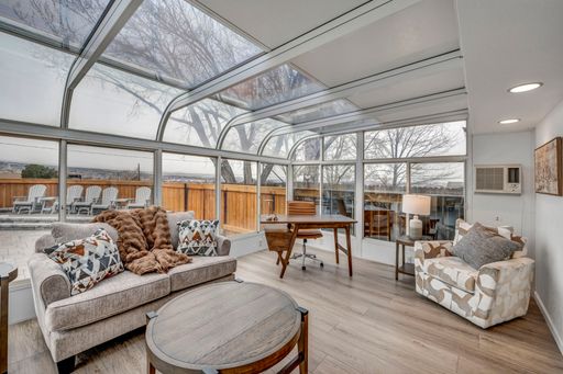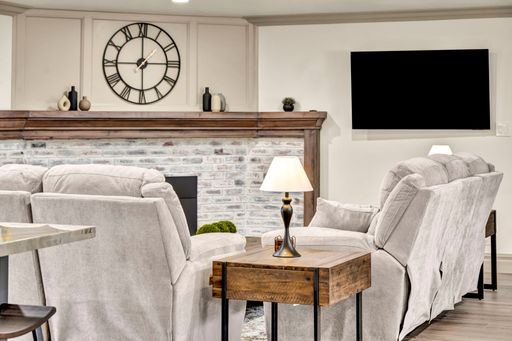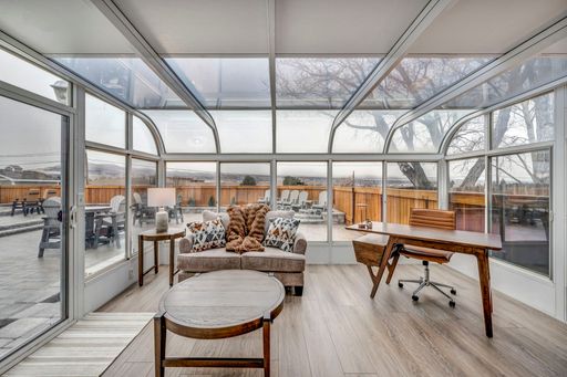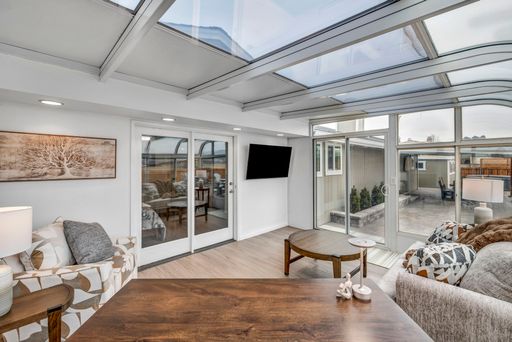 A massive island anchors the chef's kitchen, complete with premium appliances and upscale details at every turn. Dual TVs in the great room let you watch two games at once, and the gas fireplace adds the perfect cozy touch. The former greenhouse atrium now serves as a stunning office filled with natural light, creating a work-from-home space that truly feels like an oasis—with its own TV to keep you connected.